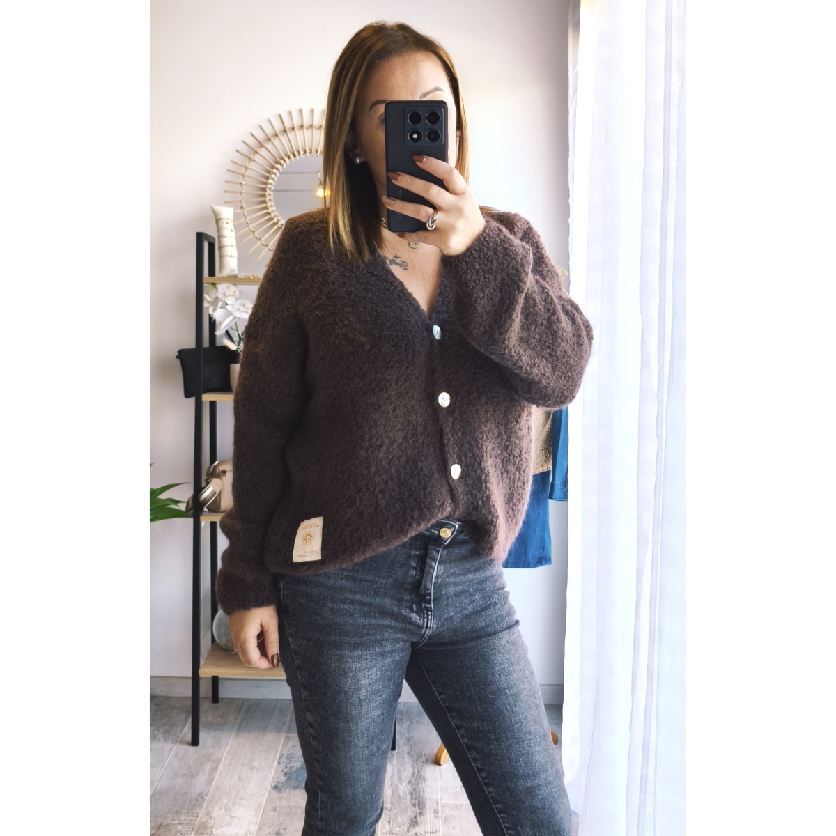 Gilet bouclette chocolat. Modéle parfait pour compléter notre garde-robe.