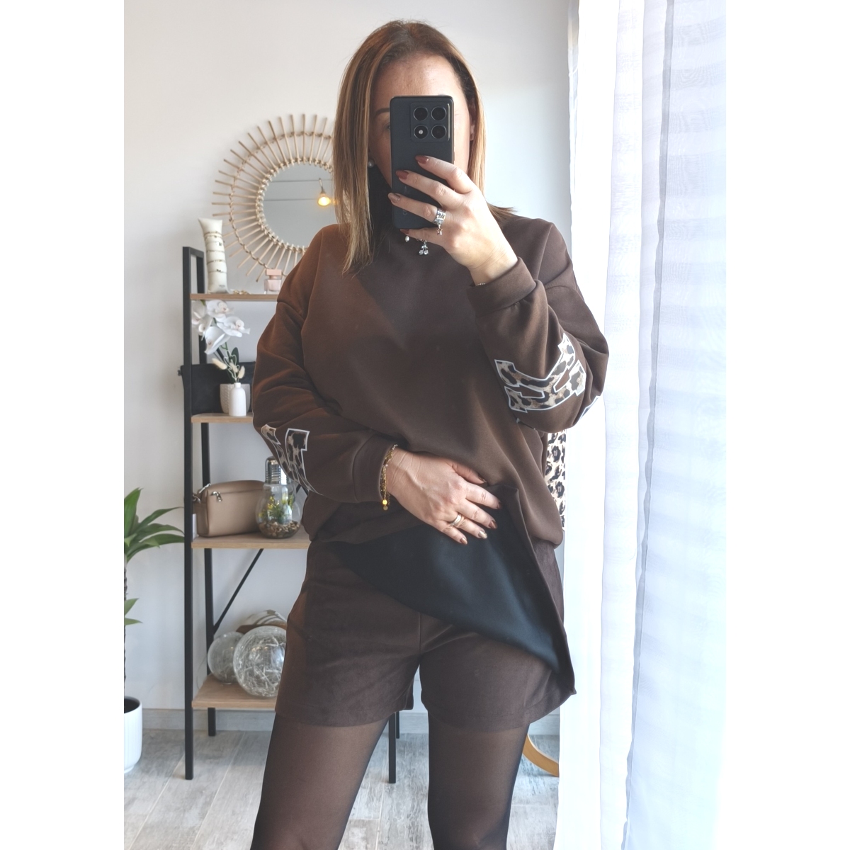Jupe short chocolat, taille haute. Modéle parfait pour compléter notre garde-robe.
